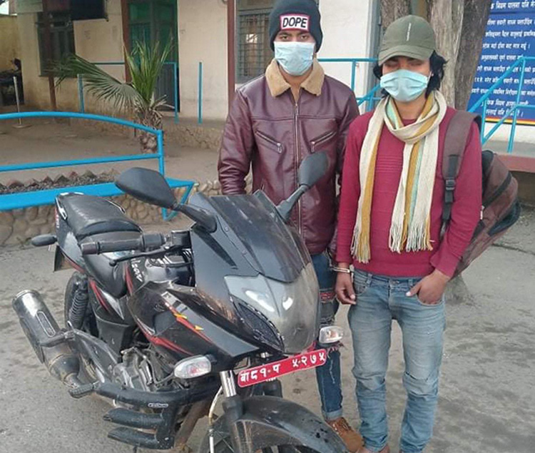 जिल्ला रामेछाप मन्थली नगरपालिका वडा नं १२ घर भएका २५ बर्षीय रामशरण मिजार र बर्ष १९ को सुवास मिजारलाई चोरी गरेको बा ८१ प ५२७५ कालो रङको पल्सर २२० मोटरसाईकलसहित पक्राउ गरेको महानगरीय ट्राफिक प्रहरी महाशाखाका प्रमुख एसएसपी जनक भट्टराईले जानकारी दिए।