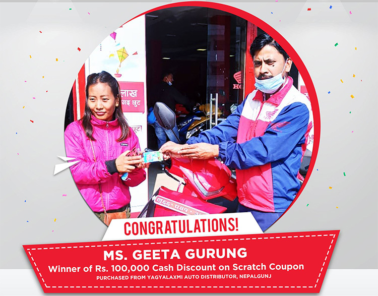 काठमाडौं । होन्डाले ल्याएको दशैं स्कीम अन्र्तगत गिता गुरुङले १ लाख नगद जितेकी छन् । नेपालगन्जका गुरुङले यज्ञलक्ष्मि अटो डिस्टिव्युटरबाट होन्डा स्कुटर खरिद गर्दा १ लाख जितेकी हुन् ।