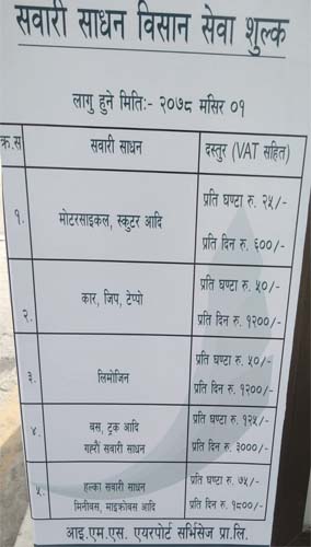 काठमाडौं । त्रिभुवन अन्तर्राष्ट्रिय विमानस्थल भित्र नयाँ पार्किङ शुल्क लागू भएको छ । पार्किङको ठेक्का पाएको आइएमएस एयरपोर्ट सर्भिसेज प्रालिले मंसिर १ गतेदेखि लागू हुने गरी विमानस्थलभित्र पार्किङ गर्दा लाग्ने नयाँ शुल्क तोकेको हो ।