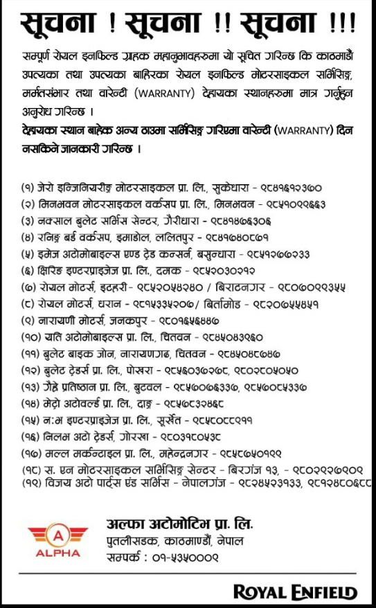 काठमाडौं । रोयल इनफिल्डको आधिकारिक विक्रेता अल्फा अटोमोबाइल्सले आफ्नो नयाँ सर्भिस सेन्टरको सूची सार्वजनिक गरेको छ ।