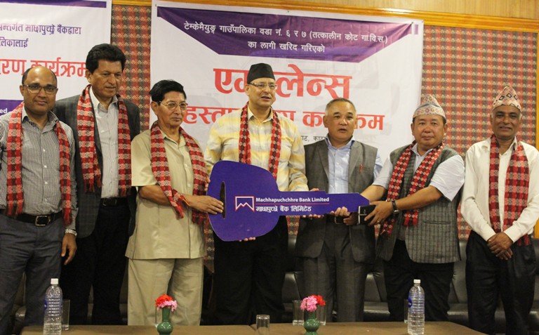 काठमाडाै । माछापुछ्रे बैंक लिमिटेडको संस्थागत सामाजिक उत्तरदायित्व एवं भोजपुर कोट सेवा समाज र कोट वासीहरुको सक्रियतामा खरिद गरिएको एम्बुलेन्सलाई माछापुछ्रे बैंक तथा भोजपुर कोट सेवा समाजले संयुक्त कार्यक्रम आयोजना गरी यहि श्रावण १९ गते हस्तान्तरण गरेको छ । उक्त कार्यक्रममा बैंकका तर्फबाट सञ्चालकद्वय जयमुकुन्द खनाल तथा राम मान श्रेष्ठले भोजपुर कोट सेवा समाजका अध्यक्ष राज बहादुर राईर टेम्केमैयुङ गाउँँपालिका वडा नं. ७ का वडाध्यक्ष उद्धव कुमार राईलाई एम्बुलेन्सको चाँबी हस्तान्तरण गरिएको हो । उक्त कार्यक्रमा एम्बुलेन्स खरिद गर्न आर्थिक सहायता गर्ने स्थानीयहरुलाई समेत कदरपत्र तथा खादाद्वारा सम्मान गरिएको थियो ।