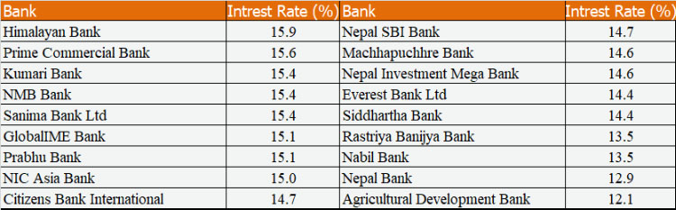 सबैभन्दा उच्च ब्याजदर हिमालयन बैंकको १५.९ प्रतिशत छ । यस बैंकले १०.९२ प्रतिशत आधारदरमा ५ प्रतिशतसम्म प्रिमियम थपेर सवारी कर्जा उपलब्ध गराइने जनाएको छ ।