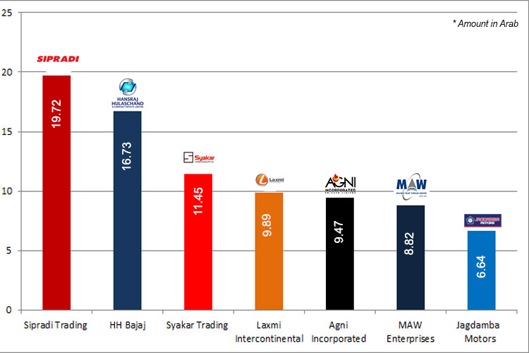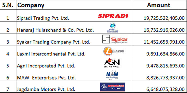 यामाहा र स्कोडाको आधिकारीक वितरक एमएडब्ल्यू इन्टरप्राइजेजले ८ अर्व ८२ करोड ६७ लाख ७३ हजार ९३७ रुपैयाँको कारोबार गरेको छ । त्यसैगरि टीभीएस मोटरसाइकलको आधिकारीक वितरक जगदम्बा मोटर्सले ६ अर्ब ६४ करोड ८० लाख ७५ हजार ३२८ रुपैयाँको कारोबार गरेको ठूला करदाता कार्यालयको तथ्यांकमा उल्लेख छ ।