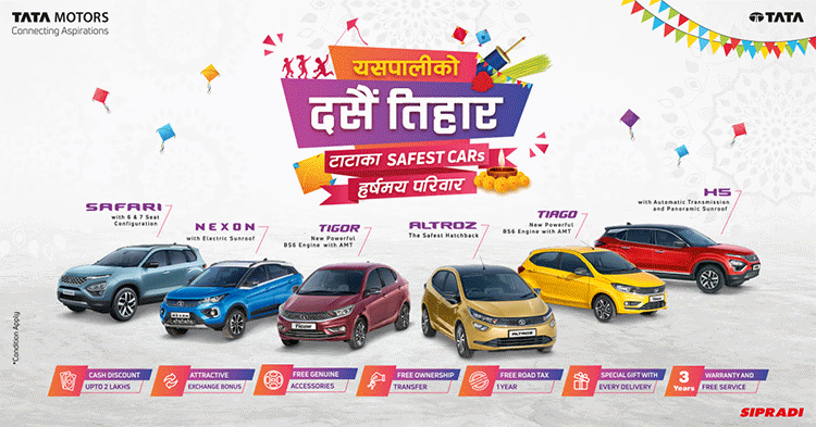 त्यसैगरी टाटाको आधिकारीक विक्रेता सिप्रदी ट्रेडिङले ‘यसपालीको दशैं तिहार, टाटाका सेफेस्ट कार’ योजना दिएको छ । यस योजनामा कार किन्ने ग्राहकलाई २ लाखसम्म नगद छुट, आकर्षक एक्स्चेन्ज अफर, निःशुल्क जेनुइन एसोशरिज, निःशुल्क स्वामित्व ट्रान्सफर सुविधा, १ वर्षको वार्षिक कर, डेलिभरी लिँदा स्पेशल गिफ्ट ह्याम्पर, ३ वर्षको वारेन्टी र निःशुल्क सर्भिस सेवा उपलब्ध गराउने जनाएको छ ।