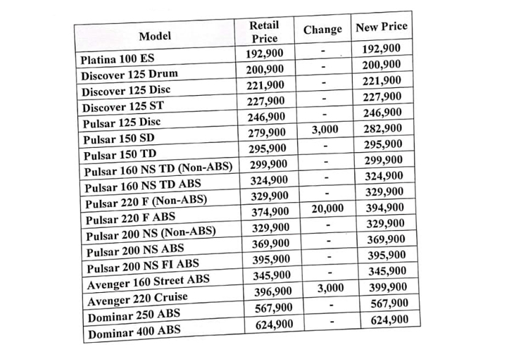 कम्पनीले जेष्ठ २५ गतेदेखि लागू हुने गरी पल्सर १५० को सिंगल डिस्क भर्सनमा ३ हजार रुपैयाँ, एभेन्जर २२० क्रुजरमा ३ हजार र पल्सर २२० एफमा २० हजार रुपैयाँ मूल्य वृद्धि गरेको हो । यी तीन मोटरसाइकलको नयाँ मूल्य क्रमशः २ लाख ८२ हजार ९००, ३ लाख ९९ हजार ९०० र ३ लाख ९४ हजार ९०० रुपैयाँ निर्धारण भएको छ ।