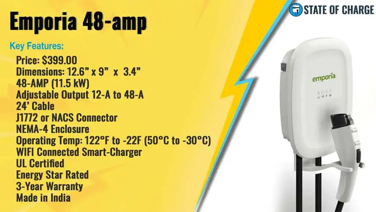 एम्पोरियाले सन् २०२२ मा उच्च गुणस्तरको ४८ एम्पीयरको चार्जर बजारमा ल्याएको हो । ३९९ अमेरिकी डलर मूल्य पर्ने उक्त चार्जर सुरक्षा प्रमाणित भएको वाइफाई कनेक्टेड स्मार्ट चार्जर हो ।