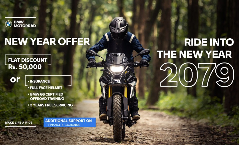 काठमाडौं । बीएमडब्ल्यू मोटरसाइकलको आधिकारिक वितरक टर्क मोटर्सले नयाँ वर्ष अफर सार्वजनिक गरेको छ । कम्पनीले बीएमडब्ल्यु मोटरसाइकलमा नगद छुट योजना ल्याएको हो ।