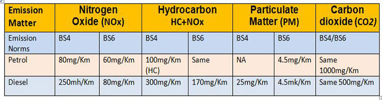 डिजल इन्जिनमा बीएस-४ भन्दा बीएस ६ मा १७० मिलिग्रामले कम हुनु पर्ने छ । हाइड्रोकार्बन पेट्रोल इन्जिनमा बीएस-४ जस्तै राखिएको छ भने, डिजलमा ३०० मिलिग्रामबाट घटाएर १७० मिलिग्राम तोकिएको छ । पर्टिकुलर मेटिरीयलमा भने पहिला पेट्रोल इन्जिनमा कुनै मापदण्ड थिएन । तर, बीएस-६ मा प्रति किलोमिटर ४.५ मिलिग्रामसम्म मात्र हुनु पर्ने बनाएको छ । जुन डिजलमा २५ मिलिग्रामबाट घटाएर पेट्रोलको जस्तै ४.५ मिलिग्राममा सिमित गरिएको छ । कार्बनडाइ अक्साइडको सम्बन्धमा भने कुनै पनि परिवर्तन गरेको छैन ।