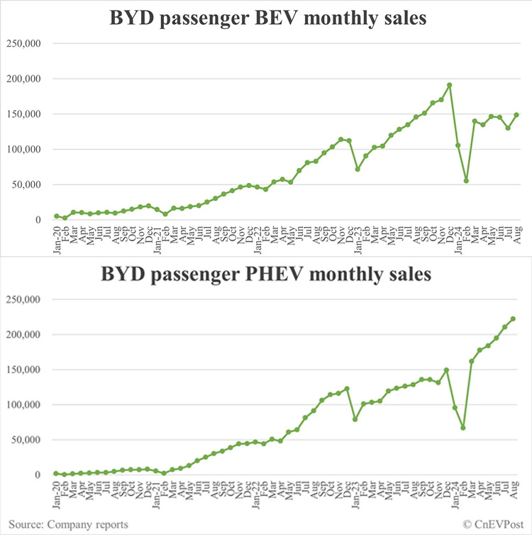 बीवाइडीले अगष्ट महिनामा २ लाख २२ हजार ३८४ यूनिट हाइब्रिड कार बिक्री गरेको हो । उक्त संख्या कुल बिक्रीको ५९.६० प्रतिशत हो ।