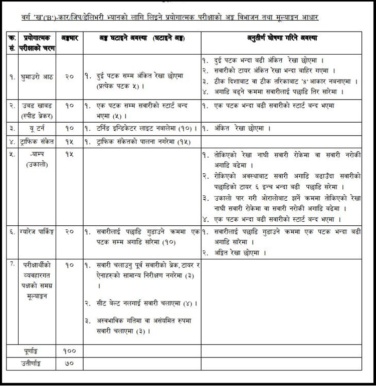 यसअघि चालकले कुनै एक स्थानमा गल्तिगर्दा सिधै फेल हुने अवस्था रहेको थियो । अब समग्रमा ७० अंक ल्याउने चालकले अनुमतिपत्र प्राप्त गर्न सक्ने छन् ।