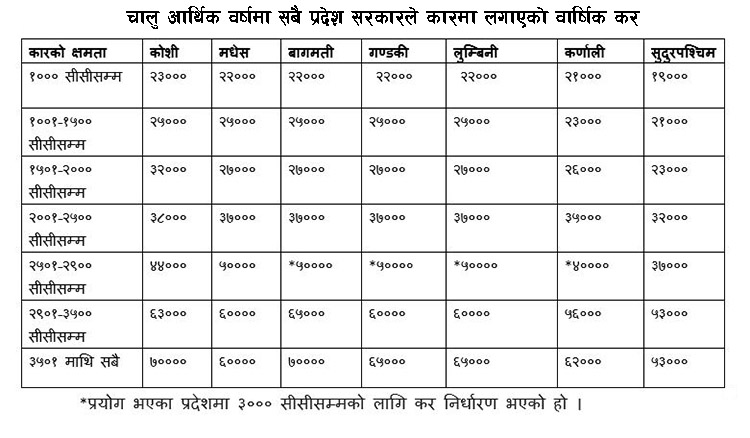काठमाडौं । प्रदेश सरकारको मुख्य आम्दानीको स्रोत बनाइएको सवारीसाधनमा लाग्ने वार्षिक शुल्क प्रदेश अनुसार फरक फरक रहँदै आएको छ । प्रदेश सरकारले आफुखसी वार्षिक कर निर्धारण गर्न थालेपछि करको दर पनि फरक भएको हो ।