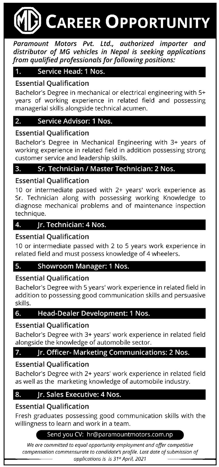 कम्पनी निकालेको विज्ञापनमा विभिन्न पदमा १६ जना माग गरिएको छ । जुनियर सेल्स एजुकेटीभ ४ जान, जुनियर अफिसर मार्केटिङ र कम्यूनिकेशन २ जना, डिलर डेभलपमेन्ट हेड १ जना, शोरुम म्यानेजर १ जना, जुनियर टेक्नीसियन ४ जना, सिनियर टेक्नीसियन २ जना, सर्भिस एड्भाइजर १ जना र सर्भिस हेड १ जनाको लागि दरखास्त आह्वान गरेको हो ।