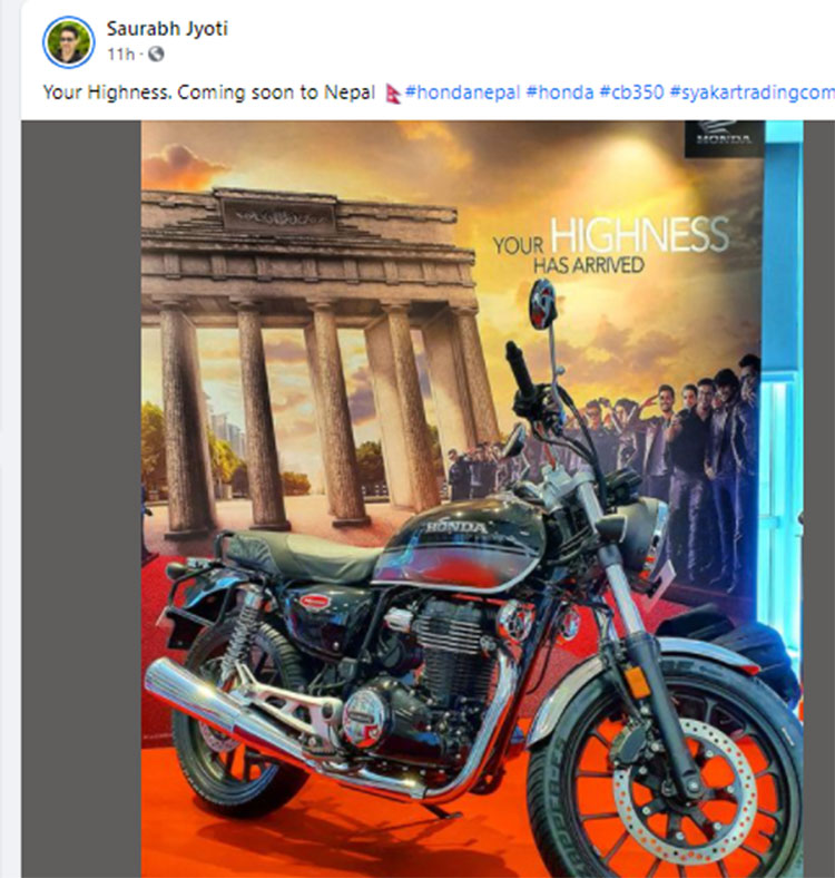 केही समयमा नै नेपालमा सार्वजनिक हुने तयारीमा रहेको सीबी हाइनेस ३५० को मूल्य वृद्धि भएका हो । कोभिडका कारण सीबी हाइनेसको सार्वजनिक हुने मिति समेत पछाडि धकेलिएको छ ।