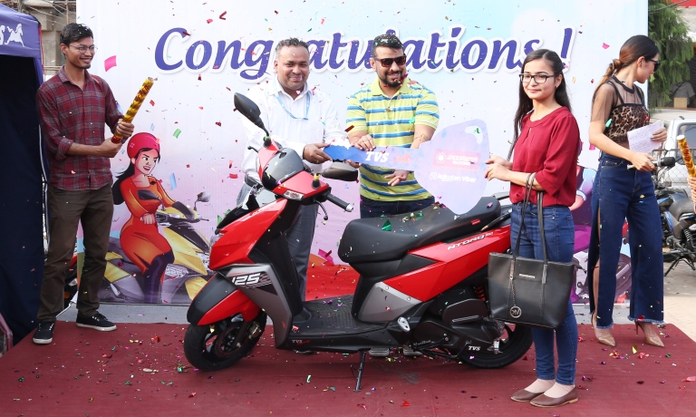जगदम्बा मोटर्सले “चान्स टु वीन थ्रु क्लिक” नामक अभियान अन्तर्गत ग्राहकहरुले ‘लभ ऐट फस्ट राईड’ स्टीकर प्याक डाउनलोड गरेर टिभीएस एनटर्क १२५ सीसीको स्कुटर जित्नुका साथै थुप्रै आकर्षक उपहारहरु प्राप्तगर्ने अवसर सृजना गरेका थिए ।