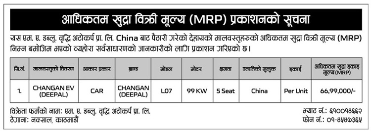 काठमाडौं । चांगनको आधिकारीक बिक्रेता एमएडब्लू वृद्धि अटोकर्पले चाँडै दिपल ब्राण्डको नयाँ कार एल-०७ बिक्री सुरु गर्ने भएको छ । कम्पनीले आज एल-०७ को अधिकतम खुद्रा बिक्री मूल्य ६६ लाख ९९ हजार रुपैयाँ प्रकाशित गरेर गाडी बिक्री गर्न खोजेको संकेत दिएको हो ।