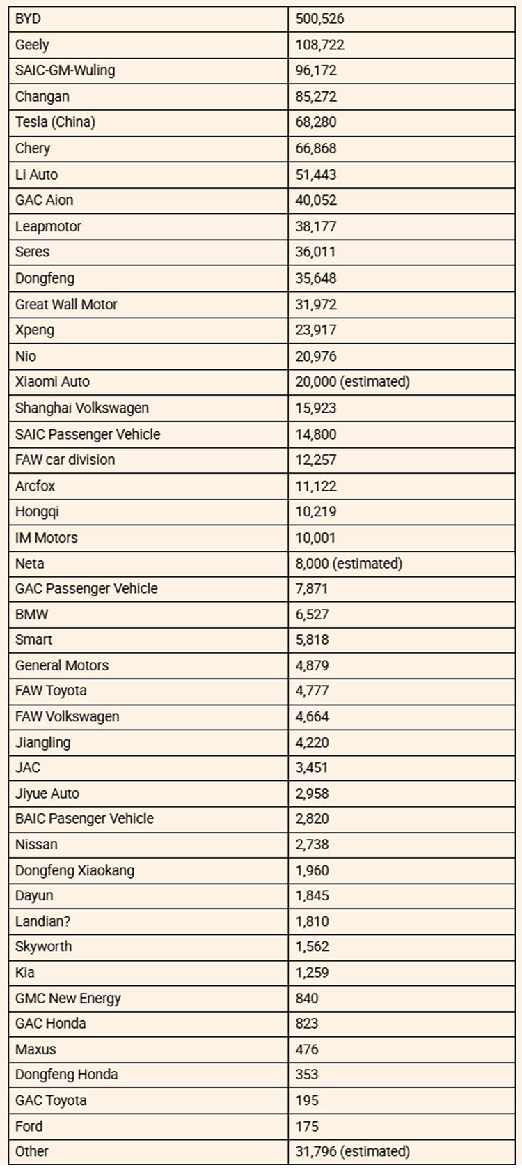 चिनियाँ बजारमा बिक्री हुने प्रत्येक २.८ वटा एनईभीमा बीवाइडीको १ मोडल हुने गरेको छ । अक्टोबरमा अमेरिकी कार कम्पनी टेस्ला ६८ हजार २८० युनिट सहित पाचौँ स्थानमा धकेलिएको छ । टेस्लाले प्योर ब्याट्री ईभी मात्र उत्पादन गर्ने भएकोले पनि प्लगइन हाइब्रिड गाडी उत्पादन गर्ने चिनियाँ कम्पनीहरूभन्दा पछाडि धकेलिएको हो ।