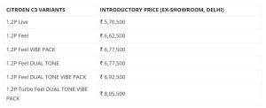 सिट्रोनले आफ्नो सब फोर मिटर कारलाई १.२ लिटर नेचुरल्ली एस्पीरेडेड इन्जिन र १.२ लिटर टर्बो इन्जिनमा ल्याएको छ । टर्बो इन्जिनमा एउटा मात्रै ‘फिल ड्यूलटोन भाइब’ भेरियन्ट सार्वजनिक गरेको छ । भारतमा यसको एक्स शोरुम मूल्य ८ लाख ५ हजार ५०० भारतीय रुपैयाँ तोकिएको छ ।