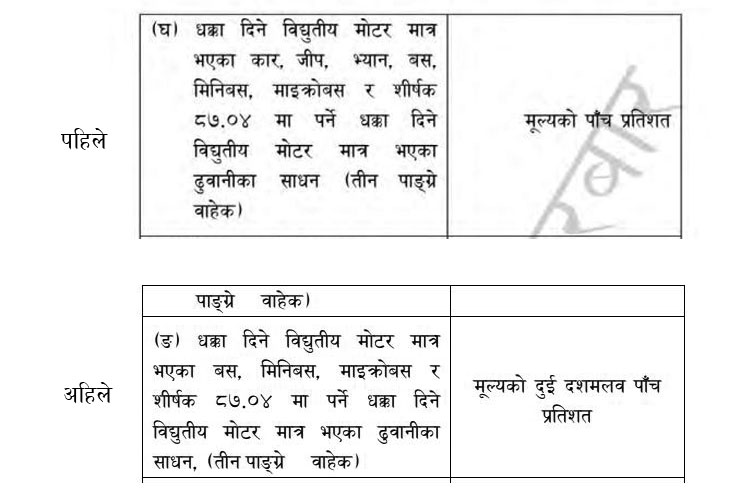 धक्का दिने विद्युतीय मोटर मात्र भएका बस, मिनिबस, माइक्रोबस र शिर्षक ८७.०४ मा पर्ने धक्का दिने विद्युतीय मोटर मात्र भएका ढुवानीका साधन (तीन पांग्रे बाहेक) का साधनमा मूल्यको २.५ प्रतिशत कर लाग्ने व्यवस्था गरिएको हो ।