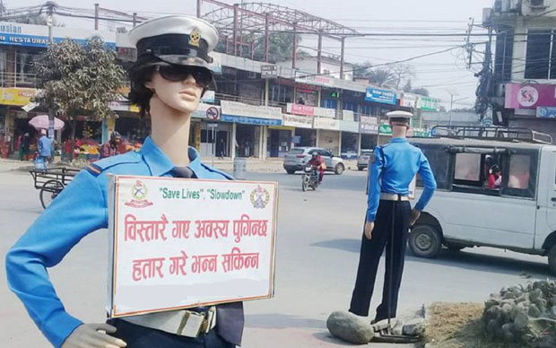 झापाको काँकडभिट्टादेखि गौरीगञ्जसम्मको सडकखण्डमा ट्राफिक प्रहरीको नमूना आकृतिको बोर्ड बनाएर ‘डमी ट्राफिक’ का रुपमा राखिएको छ ।