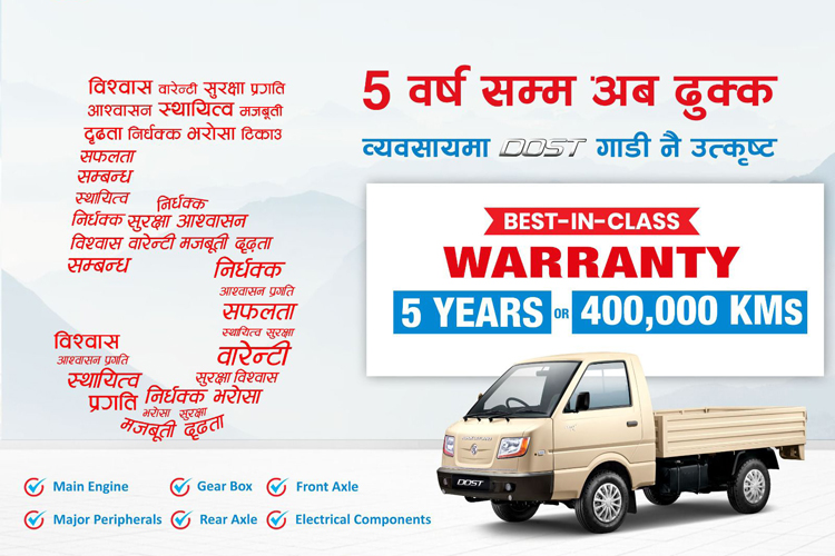 काठमाडौं । लाइट कमर्सियल भेहिकल ‘दोस्त’मा ५ वर्षको वारेन्टी पाइने भएको छ । दोस्त उत्पादक कम्पनी अशोक लेल्याण्डले यो गाडीमा ५ वर्षको वारेन्टी घोषणा गरेको हो ।