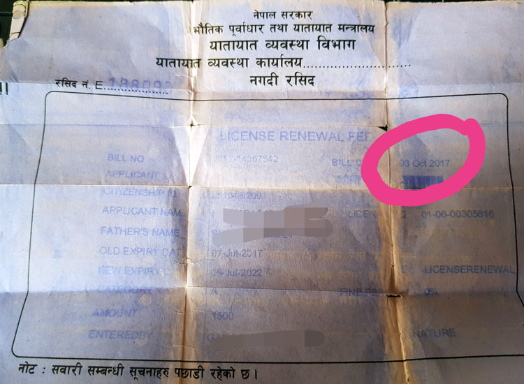 ३ अक्टूवर २०१७ मा नविकरणको लागि आबेदन दिएको लाईसेन्स आजसम्म विभागले उपलब्ध गराएको छैन । काठमाडौं मनमैजुका सुरेस बस्नेतले करिब एक बर्ष अगाडि आबेदन दिएको उक्त लाईसेन्स ६ सेम्टेम्वर २०१८ मा एसएमएसमार्फत जानकारी लिँदा १४ सेप्टेम्वरमा लाईसेन्स लिन सम्बन्धित कार्यलयमा जानु भनेर सुचना आयो ।