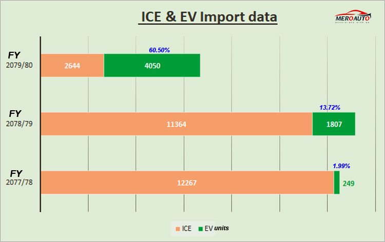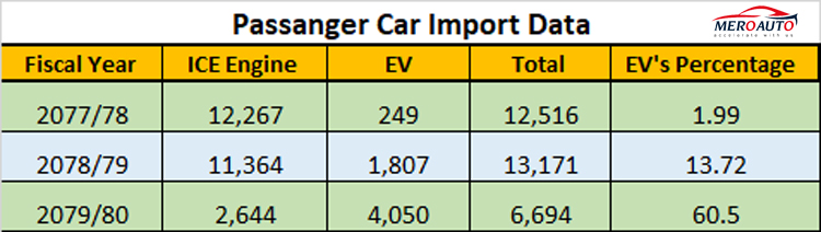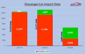 आर्थिक वर्ष २०७७/७८ मा कुल चार पाङ्ग्रे निजी सवारीसाधनको आयात १२ हजार ५१६ यूनिट रहेकोमा ईभीको हिस्सा १.९८ प्रतिशत मात्रै थियो । त्यो आर्थिक वर्षमा केबल २४९ यूनिट ईभी मात्रै आयात भएको भन्सार विभागको तथ्यांकले देखाएको छ ।