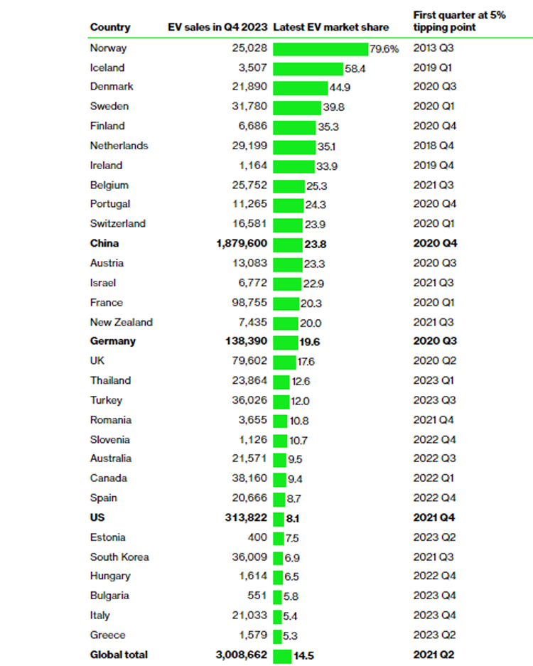 नेदरल्याण्डले सन् २०१८ को चौथो क्वाटरमा यो आँकडा पार गरेको थियो । नर्वेमा अहिले कुल कार बिक्री मध्ये ईभीको हिस्सा ७९.६ प्रतिशत रहेको छ । टीपीङ रिसर्चले नेपाललाई सूचीमा समाबेस गरेको छैन । नेपाल पनि धेरै ईभी बिक्री हुने देशको सूचीमा नर्वेपछि आउँछ । नेपालमा पनि अहिले ७५ प्रतिशत माथि ईभीको बजार हिस्सा पुगेको छ ।