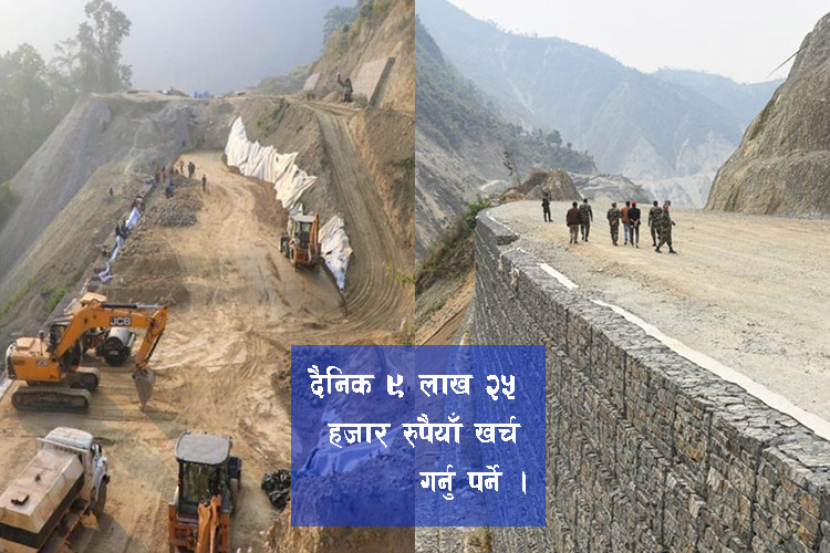 द्रुतमार्ग निर्माणमा अहिलेसम्म ४१ अर्ब ३६ करोड रुपैयाँ खर्च भएको छ । निर्माण सुरु गर्ने समयमा अनुमानित लागत १ खर्ब १६ अर्ब रुपैयाँ भनिएपनि अहिले त्यो बढेर १ खर्ब ७५ अर्ब रुपैयाँ पुगेको छ । एकातिर केवल ४१ अर्ब खर्च हुनु र अर्को तर्फ दैनिक ९ लाख २५ हजार ५०० रुपैयाँ दैनिक खर्च गर्नु पर्ने दवावमा सेना पुगेको छ ।