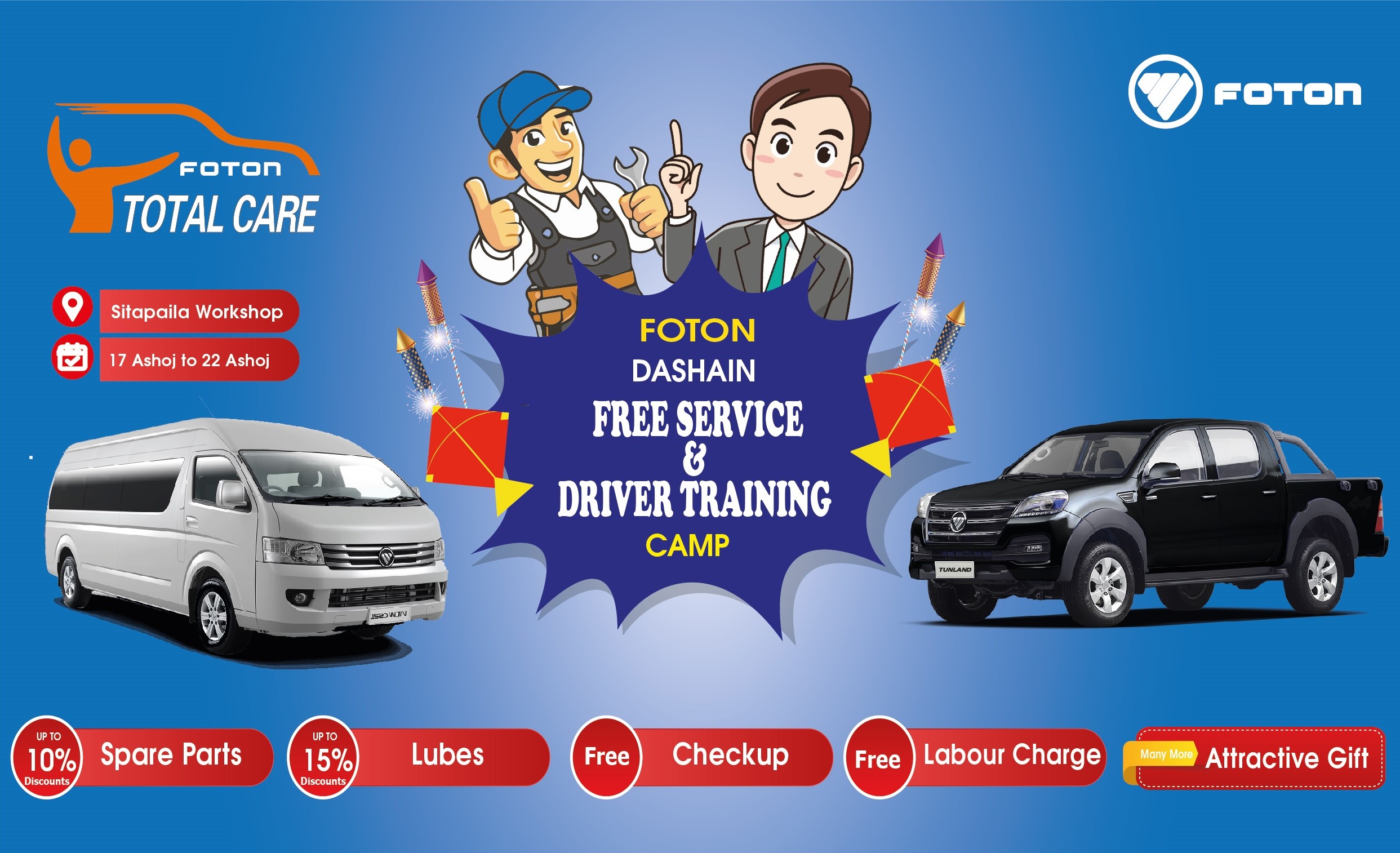 उक्त अवधिभर फोटोन गाडीका ग्राहकहरुले फोटोन जेन्यूइन स्पेयर पार्टसमा १० प्रतिशत छुट, ल्युब्रिकेट्समा १५ प्रतिशत छुट तथा अन्य लेवर चार्ज र चेकअप मा सत प्रतिशत छुट प्राप्त गर्नेछन् ।