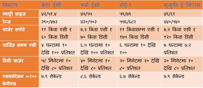 ब्याट्री साइजमा महिन्द्रा बीई-६ सबैभन्दा ठूलो देखिन्छ । बीई-६ मा ५९ र ७९ किलोवाट आवरको ब्याट्री रहेको छ । यी एसयूभी मध्ये सबैभन्दा सानो ब्याट्री हुन्डाई क्रेटामा छ । क्रेटामा ४२ र ५१.४ किलोवाट आवरको ब्याट्री छ ।