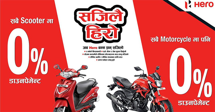 हिरोको अफरः सून्य प्रतिशत डाउन पेमेन्टमा मोटरसाइकल/स्कुटर किन्न पाइने