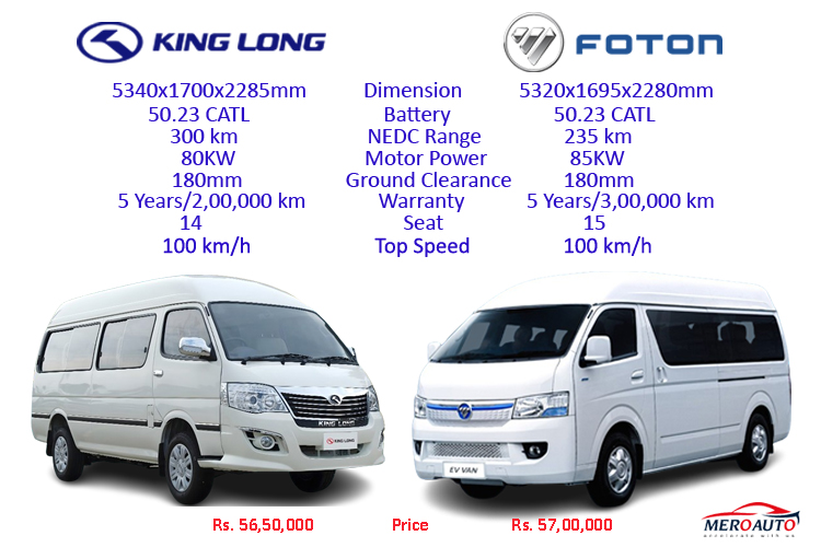 किङलङको माइक्रो भ्यान १४ सिट क्षमताको रहेको छ । यसको मूल्य ५६ लाख ५० हजार तोकिएको छ । त्यस्तै फोटनको माइक्रो भ्यान १५ सिट क्षमताको रहेको छ । यसको मूल्य ५७ लाख रहेको छ ।