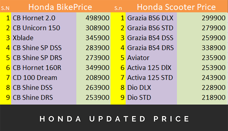 यस्तो छ होन्डा मोटरसाइकल तथा स्कुटरको नयाँ मूल्य
