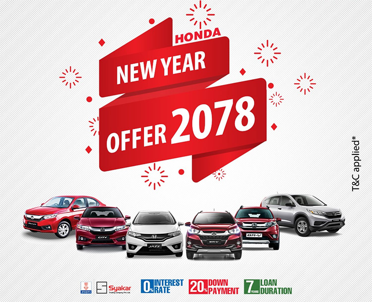 कम्पनीले आफ्नो २०१५ मोडल सिभिक भिस्टा र २०१८ मोडल होन्डा सिटी भि एमटीमा व्याज नलाग्ने स्कीम सार्वजनिक गरेको छ । यो स्कीममा डाउन पेमेन्ट पनि ग्राहकले आफ्नो छनोट अनुसार २० प्रतिशत, ३० प्रतिशत, ४० प्रतिशत, ५० प्रतिशत र त्योभन्दा माथि पनि गर्न पाउने जनाएको छ ।