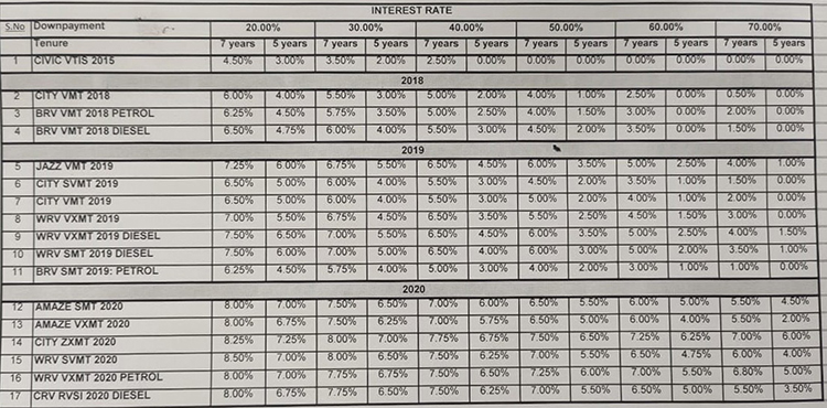 होन्डाको स्कीममा ७० प्रतिशत डाउन पेमेन्टगर्दा २०१८ र २०१९ मोडलका कारमा अत्यन्त कम र विना व्याजमा पनि कर्जा सुविधा पाइन्छ ।