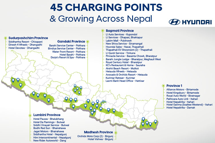 हुन्डाईले अहिले देशका विभिन्न सहरहरूमा होटल, मल तथा शोरुम लगायत ४५ स्थानमा ७ देखि २२ किलोवाटको एसी चार्जिङ पाेइन्ट निर्माण गरेको छ ।