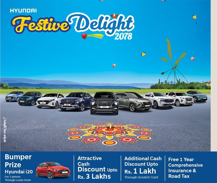 काठमाडौं । हुन्डाईको आधिकारीक विक्रेता लक्ष्मी इन्टरकन्टिनेन्टल प्रालिले दशैं तिहार योजना सार्वजनिक गरेको छ । कम्पनीले ‘फेस्टीभ डिलाइट २०७८’ नामक योजना सार्वजनिक गरेको हो ।
