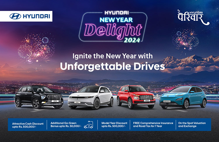 काठमाडौं । हुन्डाईको आधिकारीक बिक्रेता लक्ष्मी इन्टरकन्टिनेन्टल प्रालिले ‘हुन्डाई न्यू इयर डिलाइट-२०२४’ स्कीम सार्वजनिक गरेको छ । कम्पनीले ल्याएको स्कीममा ग्राहकलाई नगदै नगद छुट अफर गरेको हो ।