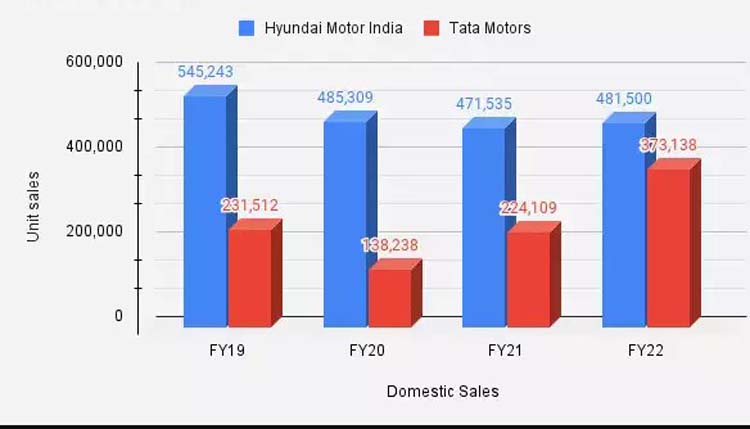 आर्थिक वर्ष २०२२ को सार्वजनिक एक रिपोर्ट अनुसार हुन्डाईले कुल ४ लाख ८० हजार यूनिट सवारी बिक्री गरेको थियो भने टाटा मोटर्सले ३ लाख ७० हजार यूनिट बेचेको थियो ।