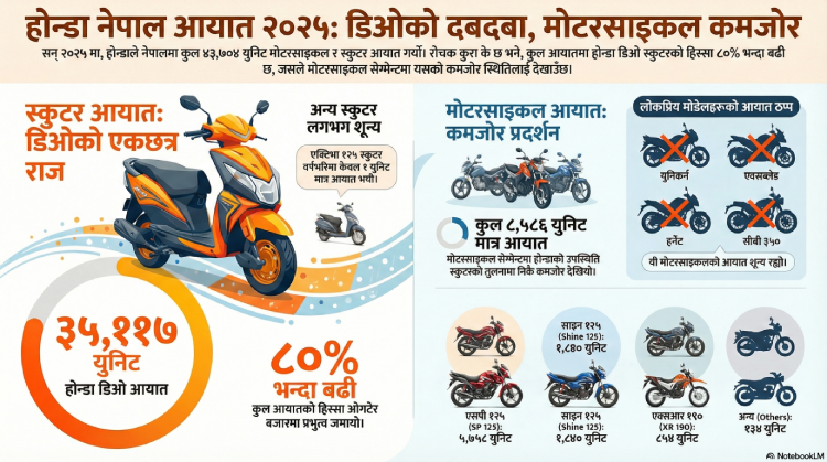 यहाँ रोचक के छ भने, कुल आयातमा ८० प्रतिशतभन्दा धेरै ३५ हजार ११७ युनिट डिओ स्कुटर आयात भएको देखिन्छ । सन् २०२५ मा स्याकार ट्रेडिङले नेपालमा आयात गरेको होण्डा डिओ ११०/१२५ सीसी सेग्मेन्टमा उपलब्ध छ ।