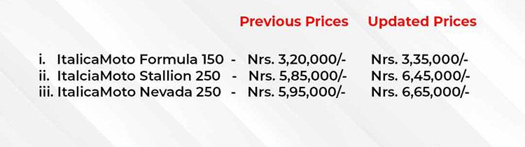 त्यस्तै, मोटरसाइकलतर्फ ६० हजार र ७० हजार रुपैयाँ वृद्धि गरेको छ । कम्पनीले विक्री गर्ने इटालीका मोटो स्टलायन २५० मा ६० हजार र इटालीका मोटो नेभाडा २५० मा ७० हजार मूल्य वृद्धि भएको छ । यी दुई मोटरसाइकलको नयाँ मूल्य क्रमशः ६ लाख ४५ हजार र ६ लाख ६५ हजार निर्धारण गरिएको छ ।