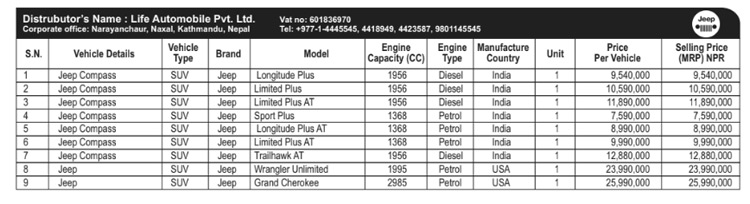 नाडा अटोमोवाइल्स एशोसिएसन अफ नेपालले साउन ८ गते सार्वजनिक गरेको आफ्ना सदस्यहरुको अधिकतम खुद्रा मूल्य (एमआरपी) जीप र्याङलर अनलिमिटेड र ग्राण्ड चेरोकीको मूल्य सार्वजनिक भएको हो ।