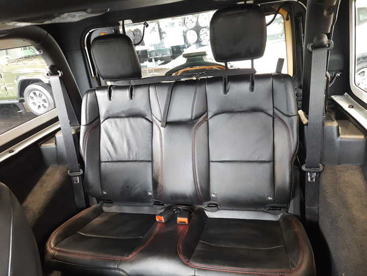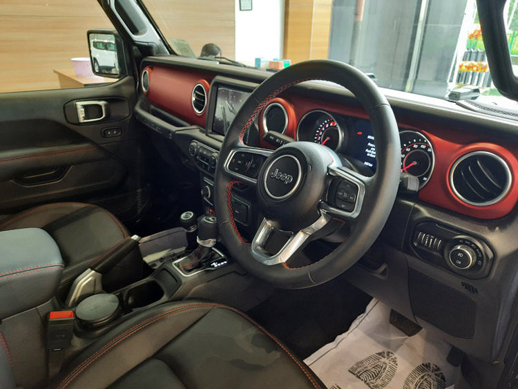 र्यांग्लरको इन्टेरियरलाई हेर्ने हो भने यसमा लेदर ड्यासबोर्ड, लेदर सिट र लेदरले र्याप गरिएको मल्टिफंक्सन स्टेरिङ ह्वील, गियर सेलेक्टर, ट्रान्सफर केस र पार्किङ ब्रेक रहेको छ । यसमा एप्पल कार प्ले र एन्ड्रोइड अटो कनेक्टिभिटीसहितको ८.४ इन्चको युकनेक्ट टचस्क्रिन इन्फोटेन्मेन्ट सिस्मट रहेको छ । साधै यसमा ७ इन्चको ड्राइभर इन्फोर्मेसन डिस्प्ले, डुअल जोन एअर कन्डिसनिङ, इन्जिन स्टप/स्टार्ट, क्रुज कन्ट्रोल, एम्बियन्ट लाइटिङ एन्ड पुस–बटन स्टार्ट पनि रहेको छ ।