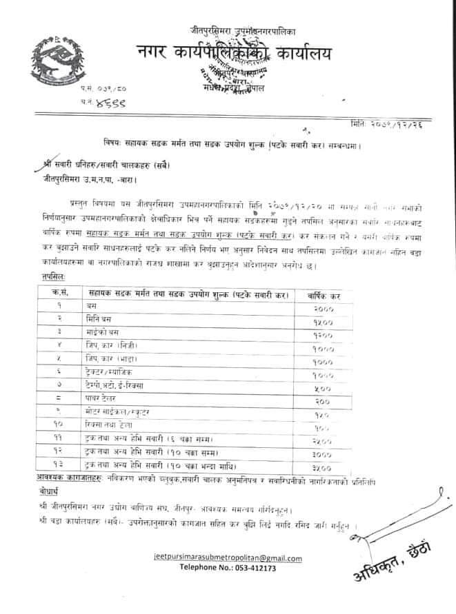 काठमाडौं । यातायात कार्यालयले सवारीसाधन राखे वापत कर लिँदै आएको छ । यसरी लगाइएको कर प्रदेश सरकारले हरेक स्थानिय निकायमा बाँडफाँड गर्दै आएको छ । तर, जीतपुरसिमरा उपमहानगरपालिकाले सार्वजनिक सूचना निकालेर सवारीधनीलाई कर तिर्न भनेको हो ।