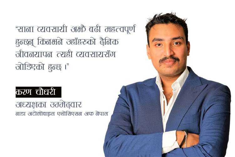 लामो कोभिड १९ महामारीले थलिएको अटोमोबाइल व्यवसाय, नाडाको भूमिका र बजारमा आउन सक्ने चुनौतीका विषयमा सिजी मोटोकर्पका कार्यकारी निर्देशक तथा अध्यक्षका उम्मेदवार करण चौधरीसँग मेरोअटोले गरेको कुराकानीको सम्पादीत अंश :