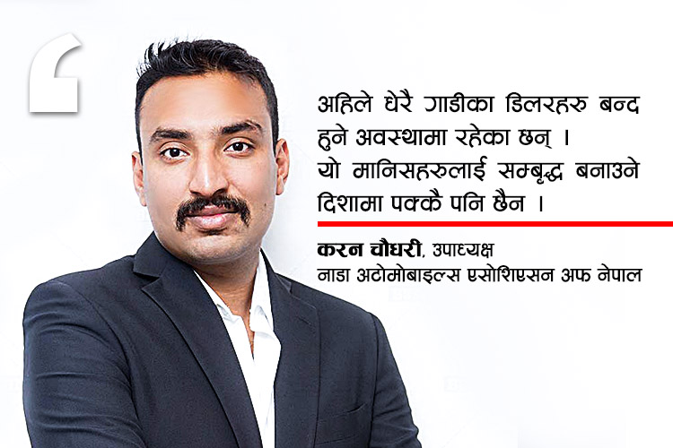 यदि कर्जाको समस्या समाधान भएन भने धेरैको व्यवसाय बन्द हुने अवस्थामा पूगेकाे छ । अटो क्षेत्रको सम्पूर्ण सञ्जाल गाडीकोे विक्रीसँग जोडिएको हुन्छ । सरकारले यो क्षेत्रलाई कसरी सम्हाल्ने भनेर सोच्नुपर्ने अवस्था आइसकेको छ । हामी सरकारलाई धेरै कर योगदान गर्ने क्षेत्र पर्छौ । त्यसले यो क्षेत्रमा परेको नकारात्मक असरले करदेखि रोजगारी र समग्र अर्थतन्त्रमा नै पर्ने कुरा नीति निर्माताले बुझेका छन् । तर, ठोस काम नगरेको अवस्था हो ।