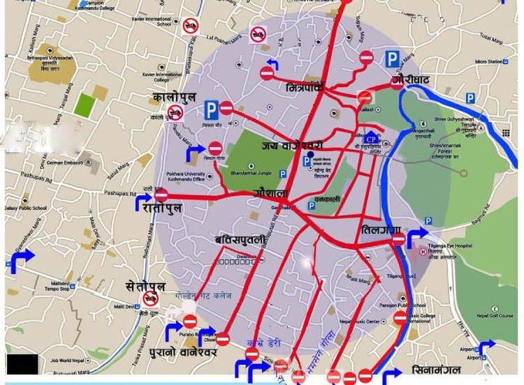 तीननकुनेबाट सिनामङ्गलतर्फ,बौद्ध एरियाबाट गौरीघाटतर्फ, पुरानो बानेश्वर, गौशाला र मित्रपार्क तर्फ आउने सम्पूर्ण मालबाहक सवारी साधनहरूलाई भने निषेध गरिएको ट्राफिक प्रहरीले जनाएको छ ।
