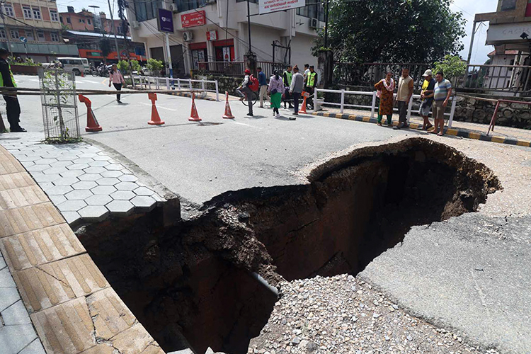 काठमाडौं महानगरपालिकाको कार्यालय रहेको काठमाडौं प्लाजा नजिकैको ‘वान वे’ सडकमा भ्वाङ परेको हो ।