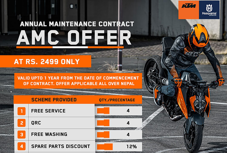 केटीएम मोटरसाइकलको नेपालका लागि आधिकारिक वितरक हंशराज हुलासचन्द एन्ड कम्पनीले केटीएमका ग्राहकलाई लक्षित गर्दै एनुअल मेन्टिनेन्स कन्ट्रयाक्ट (एएमसी) योजना ल्याएको हो ।