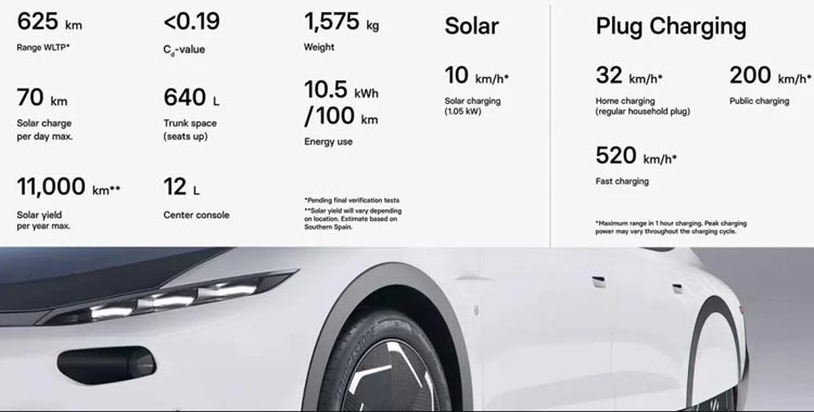 सेडान मोडलमा रहेको यो कारमा ६० किलोवाटआवरको ब्याट्री प्याक रहेको छ । यसको रेन्ज डब्ल्यूएलपीटीका अनुसार ६२५ किलोमिटर रहेको छ । साथै सोलार पावरकोसमेत जोड्ने हो भने कुल ६९५ किलोमिटर सम्मको रेन्ज पुग्न सक्दछ ।